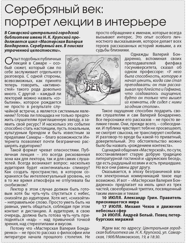 Статья анонсирует мероприятия на июль 2019 года из цикла «Мастерская Валерия Бондаренко. Серебряный век. В поисках утраченной целостности», которые состоятся в Центральной городской библиотеке имени Н.К.Крупской.