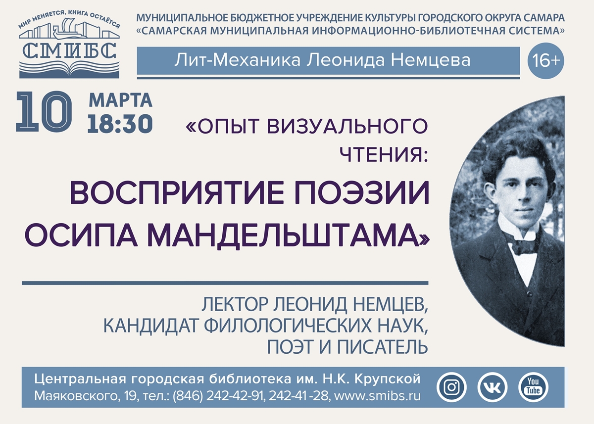 10 марта в 18:30 в Центральной городской библиотеке им. Н.К. Крупской пройдет лекция «Метод визуального чтения: восприятие поэзии Осипа Мандельштама» в рамках проекта #ЛитМеханика Леонида Немцева.