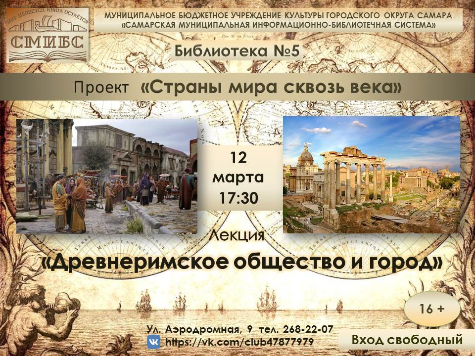 12 марта в 17:30 в Библиотеке №5 «СМИБС» в рамках проекта «Страны мира сквозь века» состоится лекция «Древнеримское общество и город».