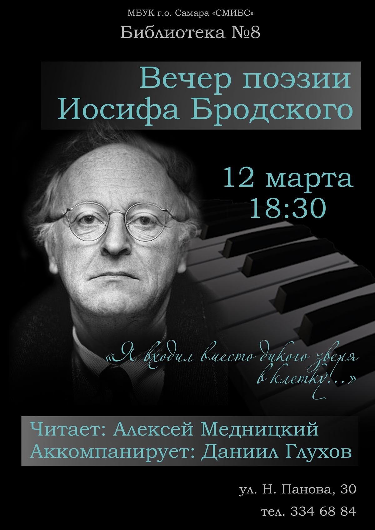 Творчество поэта, эссеиста, драматурга, переводчика Иосифа Бродского вдохновило молодых читателей библиотеки на проведение необычной встречи. Алексей Медницкий – частый гость таких мероприятий, как Библионочь, театральные читки «Голоса пьес», где и проявился его талант актера и мелодекламатора. Даниил Глухов - выпускник музыкальной школы № 3 им. М. И. Глинки, студент факультета «Музыкальное образование».