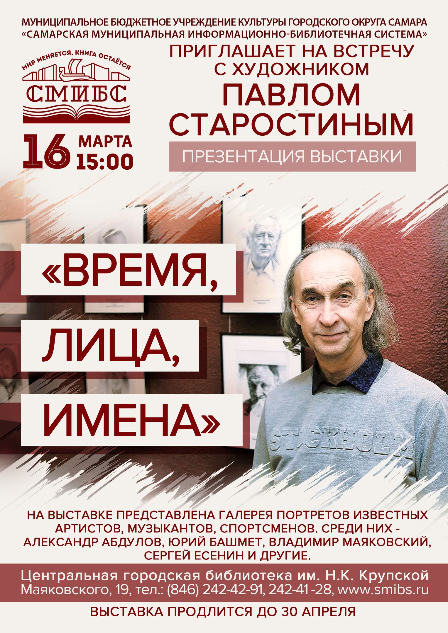 16 марта в 15:00 в Центральной городской библиотеке им. Н.К. Крупской состоится встреча с московским художником Павлом Старостиным и пройдет презентация его выставки «Время, лица, имена». На выставке представлена галерея портретов известных артистов, музыкантов, спортсменов. Среди них – Александр Абдулов, Юрий Башмет, Владимир Маяковский, Сергей Есенин и другие.
