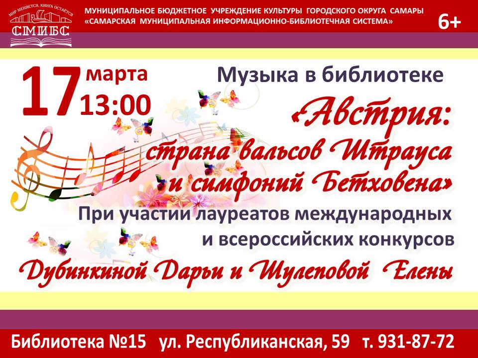 17 марта в 13:00 Библиотека №15 «СМИБС» приглашает на литературно-музыкальную композицию «Австрия: страна вальсов Штрауса и симфоний Бетховена. Мероприятие проводится в рамках перекрестного Года литературы и театра между Россией и Австрией. Для вас уникальное исполнение в четыре руки произведений Бетховена лауреатами международных и всероссийских конкурсов Дубинкиной Дарьей и Шулеповой Еленой.