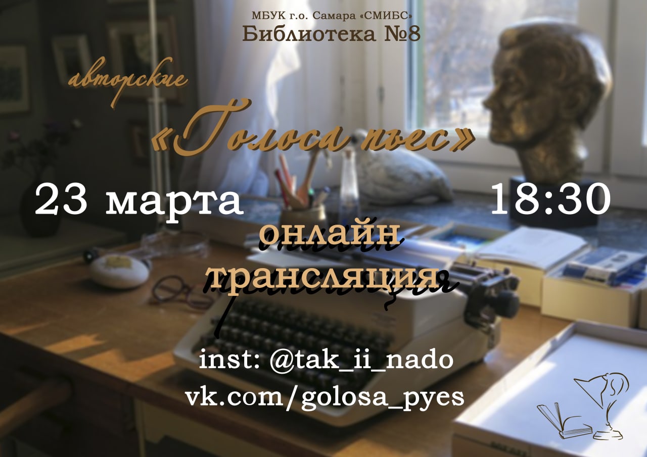 23 марта в 18:30 в Библиотеке №8 «СМИБС» состоится театральная читка. Но в прямом эфире, который вы сможете посмотреть в официальной группе Голоса пьес во «ВКонтакте» и Инстаграме режиссера проекта Игоря Кузнецова.
