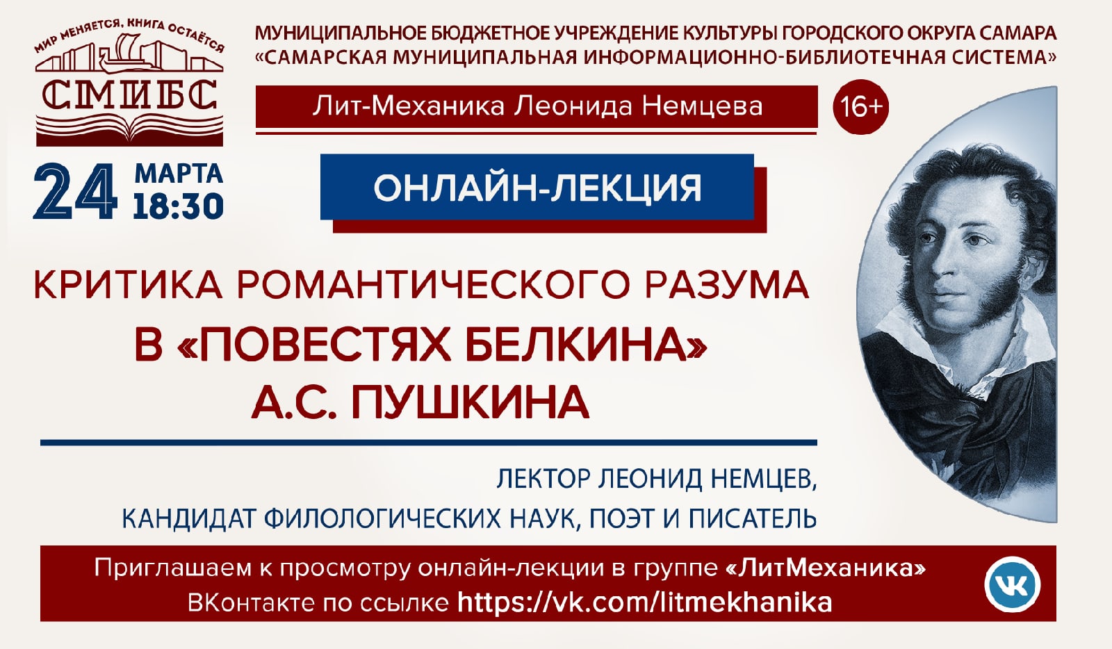 24 марта в 18:30 Центральная городская библиотека им. Н.К. Крупской проведет онлайн-трансляцию лекции Леонида Немцева «Критика романтического разума в «Повестях Белкина» А.С. Пушкина» в рамках проекта #ЛитМеханика.