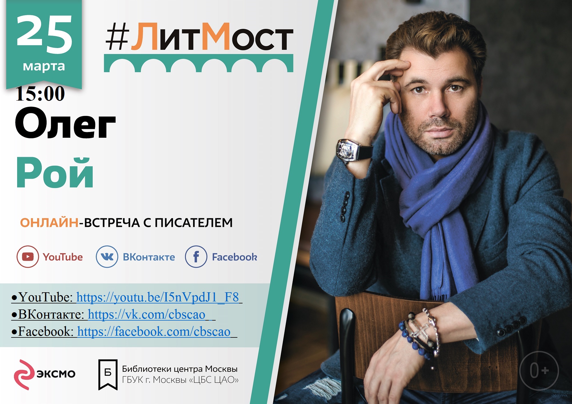 25 марта в 15:00 Библиотека №5«СМИБС»в рамках проекта «#ЛитМост. «Эксмо» объединяет» проведёт онлайн-трансляцию встречи с известным писателем Олегом Роем.
