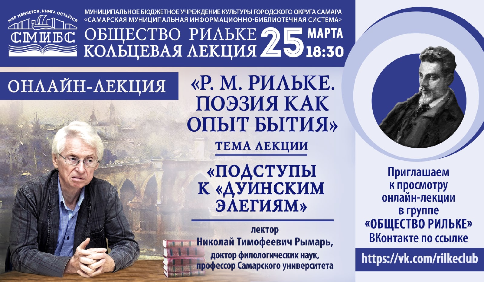 25 марта в 18:30 Центральная городская библиотека им. Н.К. Крупской приглашает читателей на онлайн-трасляцию лекции Н.Т. Рымаря «Подступы к «Дуинским Элегиям» в рамках проекта «СМИБС» «Общество Рильке».