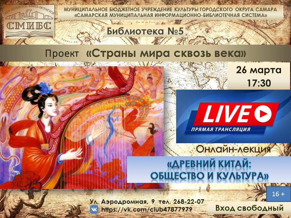 26 марта в 17:30 Библиотека №5 «СМИБС» в рамках проекта «Страны мира сквозь века» приглашает к просмотру онлайн-трансляции лекции «Древний Китай: общество и культура».