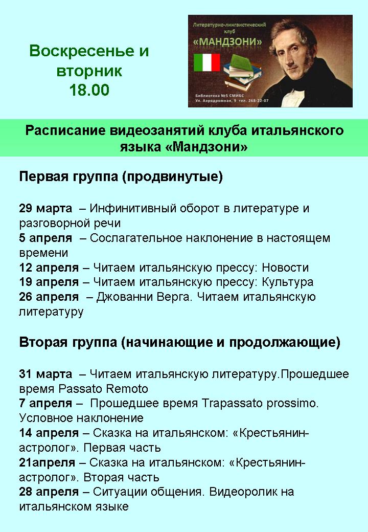 Библиотека №5 «СМИБС» продолжает занятия клуба итальянского языка в новом формате - видеозанятия.