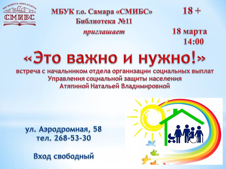 18 марта в 14:00 в Библиотеке №11 «СМИБС» пройдет встреча населения с начальником отдела организации социальных выплат №3 Управления социальной защиты населения Советского района Атяпиной Натальей Владимировной.