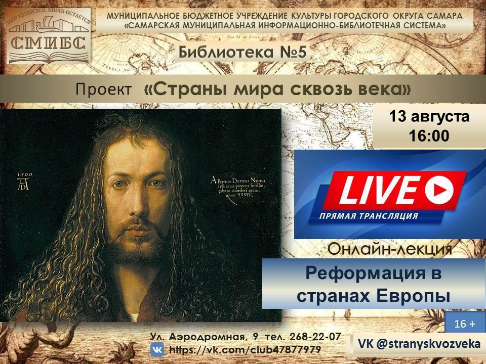 Библиотека №5 МБУК г.о. Самара «СМИБС» приглашает 13 августа в 16:00 на онлайн-лекцию «Реформация в странах Европы» в рамках проекта «Страны мира сквозь века».