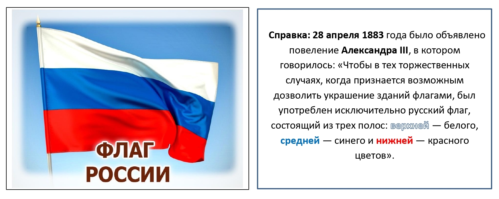 28 апреля 1883 года было объявлено повеление Александра III, в котором говорилось: «Чтобы в тех торжественных случаях, когда признается возможным дозволить украшение зданий флагами, был употреблен исключительно русский флаг, состоящий из трех полос: верхней — белого, средней — синего и нижней — красного цветов».