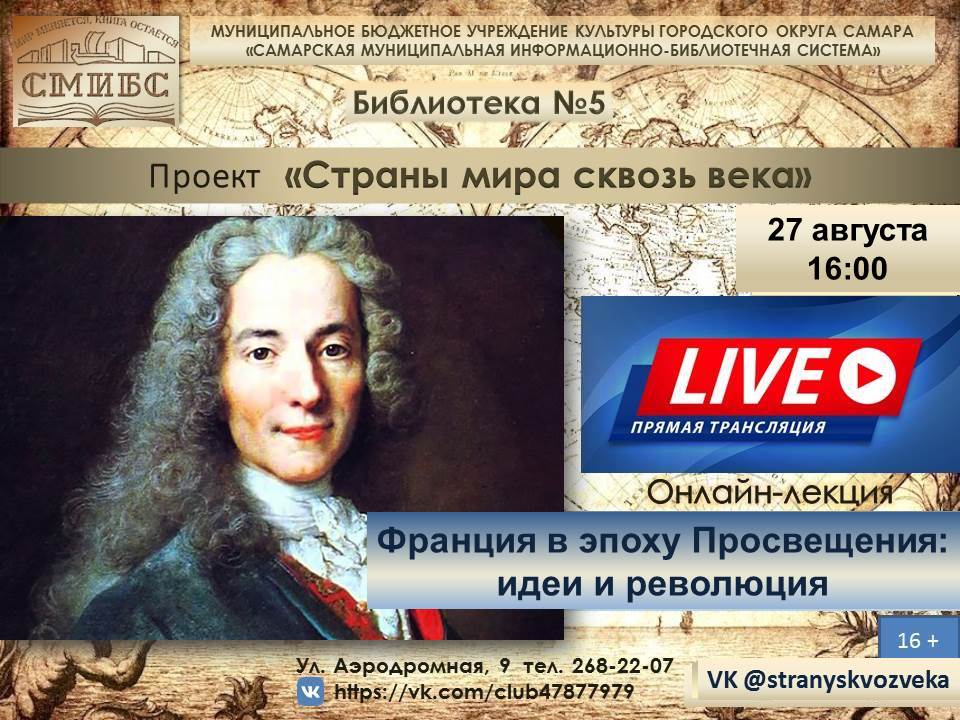 Библиотека №5 МБУК г.о. Самара «СМИБС» приглашает 27 августа в 16:00 на онлайн-лекцию по истории и культуре зарубежных стран «Франция в эпоху Просвещения: идеи и революция» в рамках проекта «Страны мира сквозь века»!