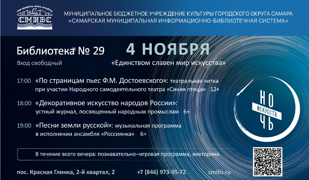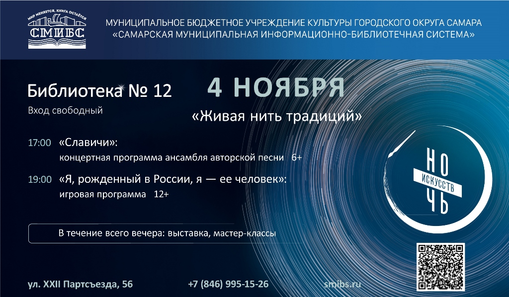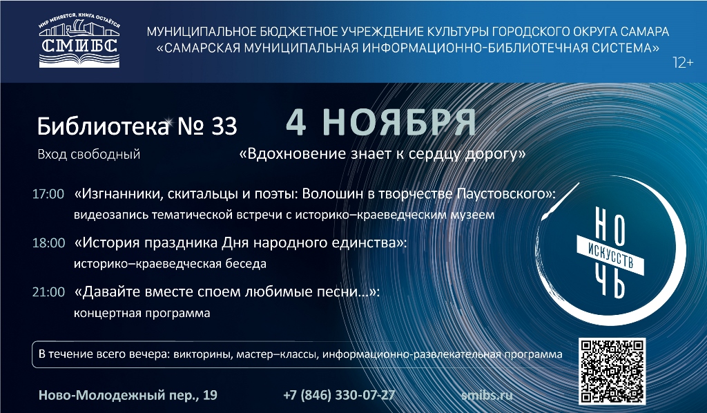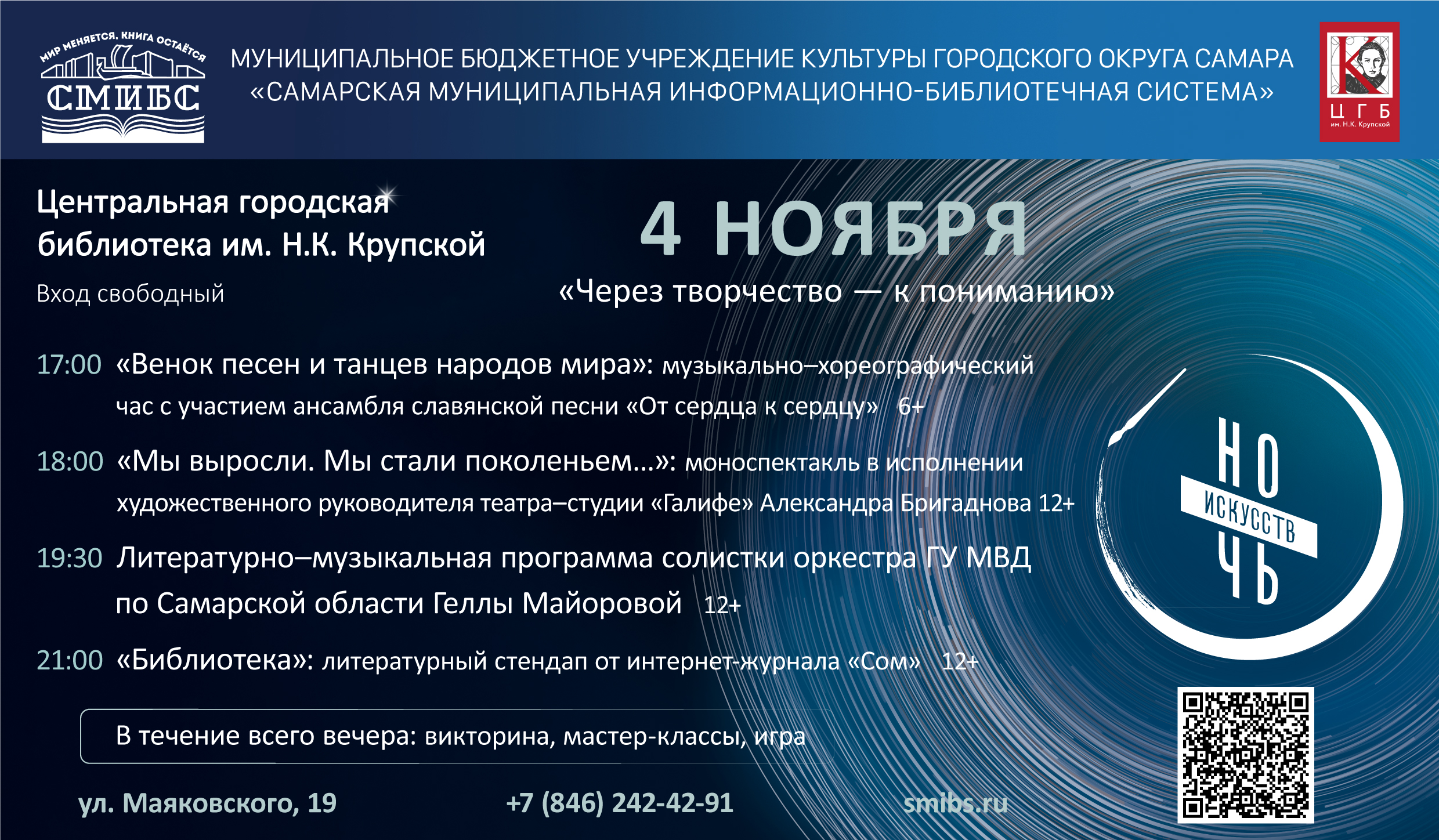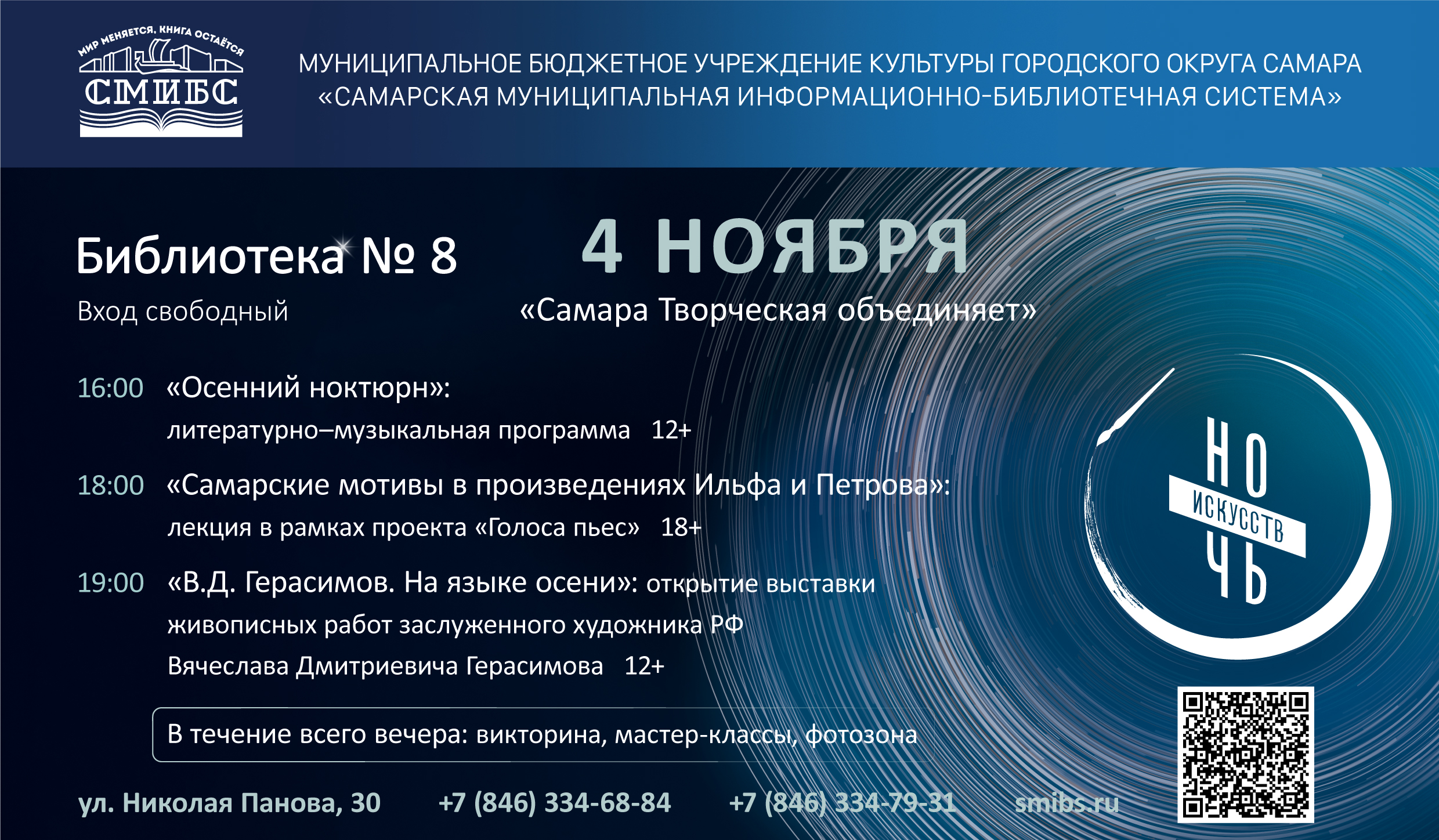 В МБУК г.о. Самара «Самарская муниципальная информационно-библиотечная система» Всероссийская акция «Ночь искусств – 2024» пройдёт на шести площадках.
