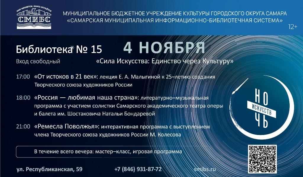 Гости библиотеки с 17:00 – 22:00 смогут познакомиться с творчеством молодых и маститых самарских художников от Е. Малыгиной (Самарская региональная организация), принять участие в интерактивной программе «Ремесла Поволжья» с выступлением члена Творческого союза художников России Колесова М., послушать солистку Самарского академического театра оперы и балета им. Шостаковича Наталью Бондареву в литературно-музыкальной программе «Россия – любимая наша страна», а также принять участие в играх и мастер-классах.