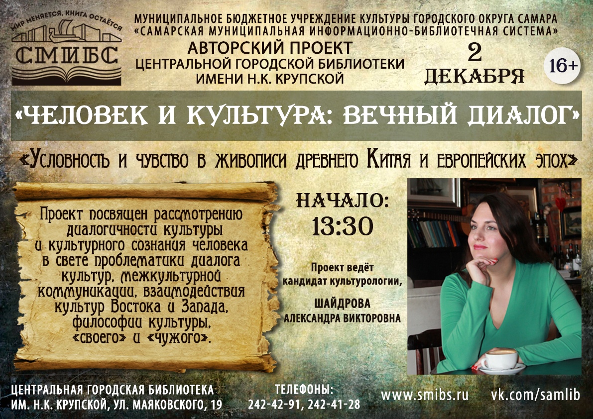 02 декабря в 13:30 Центральная городская библиотека им. Н.К. Крупской проведёт онлайн-лекцию о смещении и смешении границ между «зрителем» и произведением, его «автором» «Условность и чувство в живописи Древнего Китая и европейских эпох» в рамках проекта #СМИБС «Человек и культура: вечный диалог».