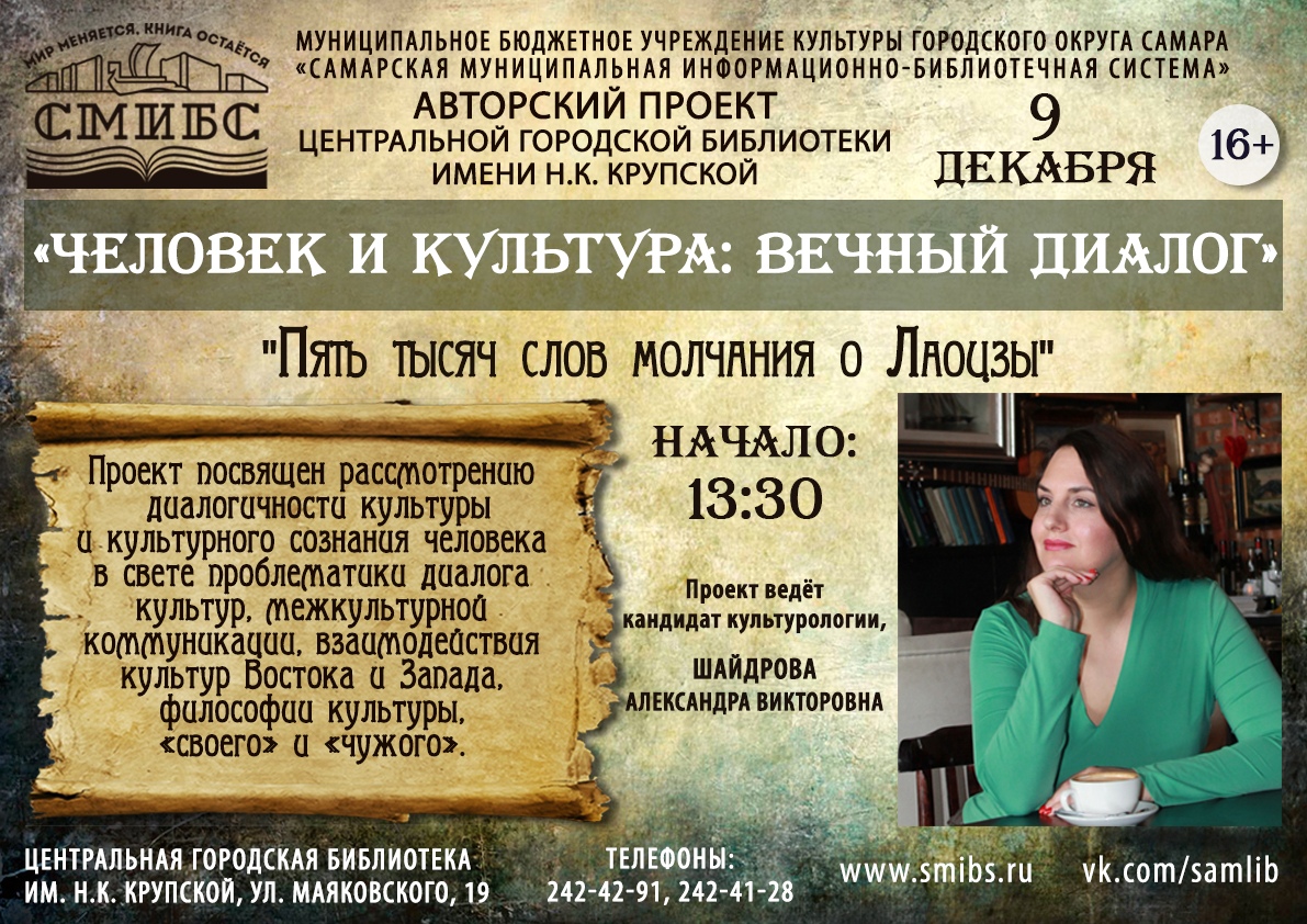 09 декабря в 13:30 Центральная городская библиотека им. Н.К. Крупской проведёт онлайн-лекцию о смещении и смешении границ между «зрителем» и произведением, его «автором» «Пять тысяч слов молчания о Лаоцзы» в рамках проекта #СМИБС «Человек и культура: вечный диалог».