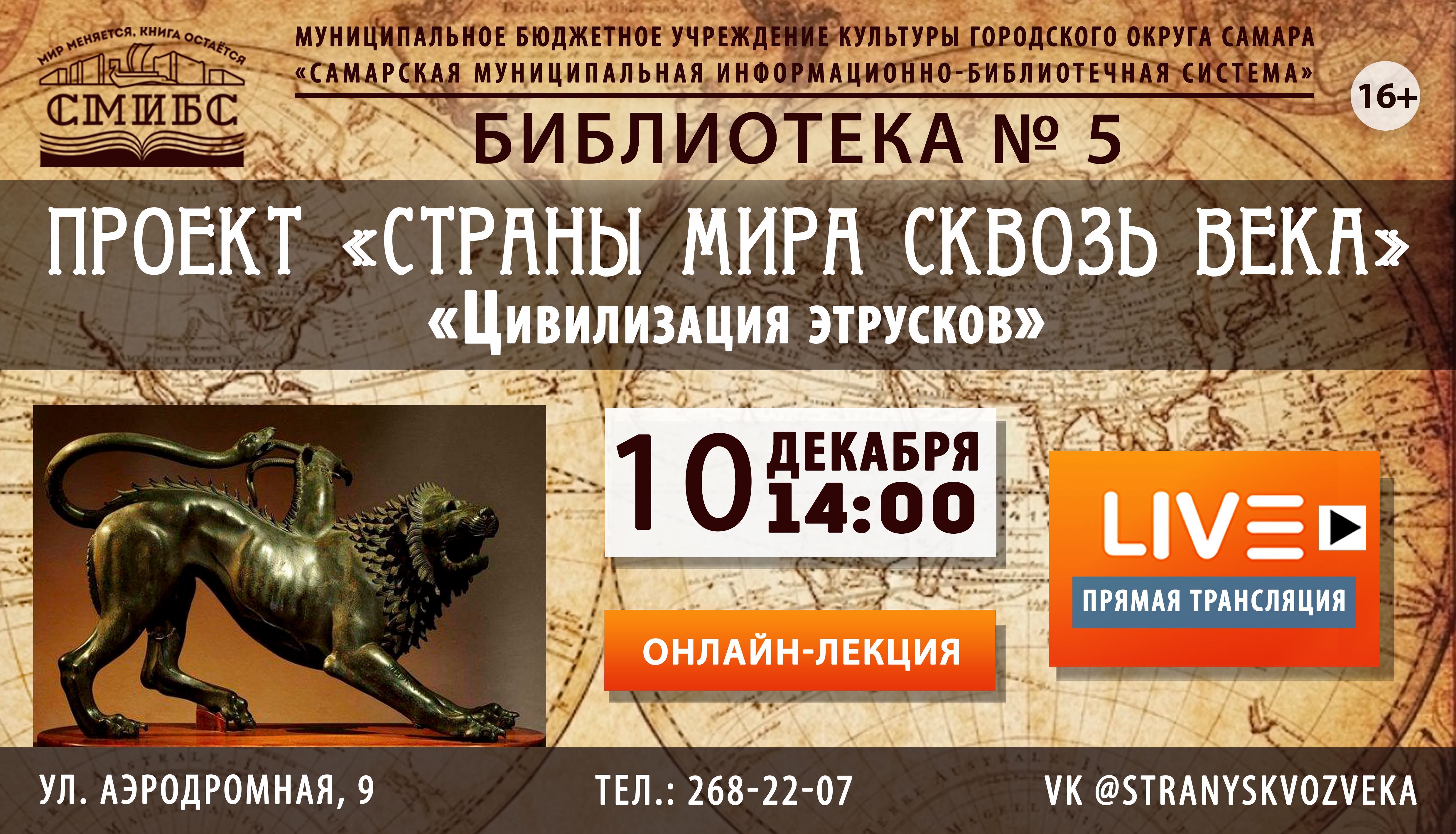 Библиотека №5 МБУК г.о. Самара «СМИБС» приглашает 10 декабря в 14:00 на онлайн-лекцию «Цивилизация этрусков» в рамках проекта «Страны мира сквозь века».