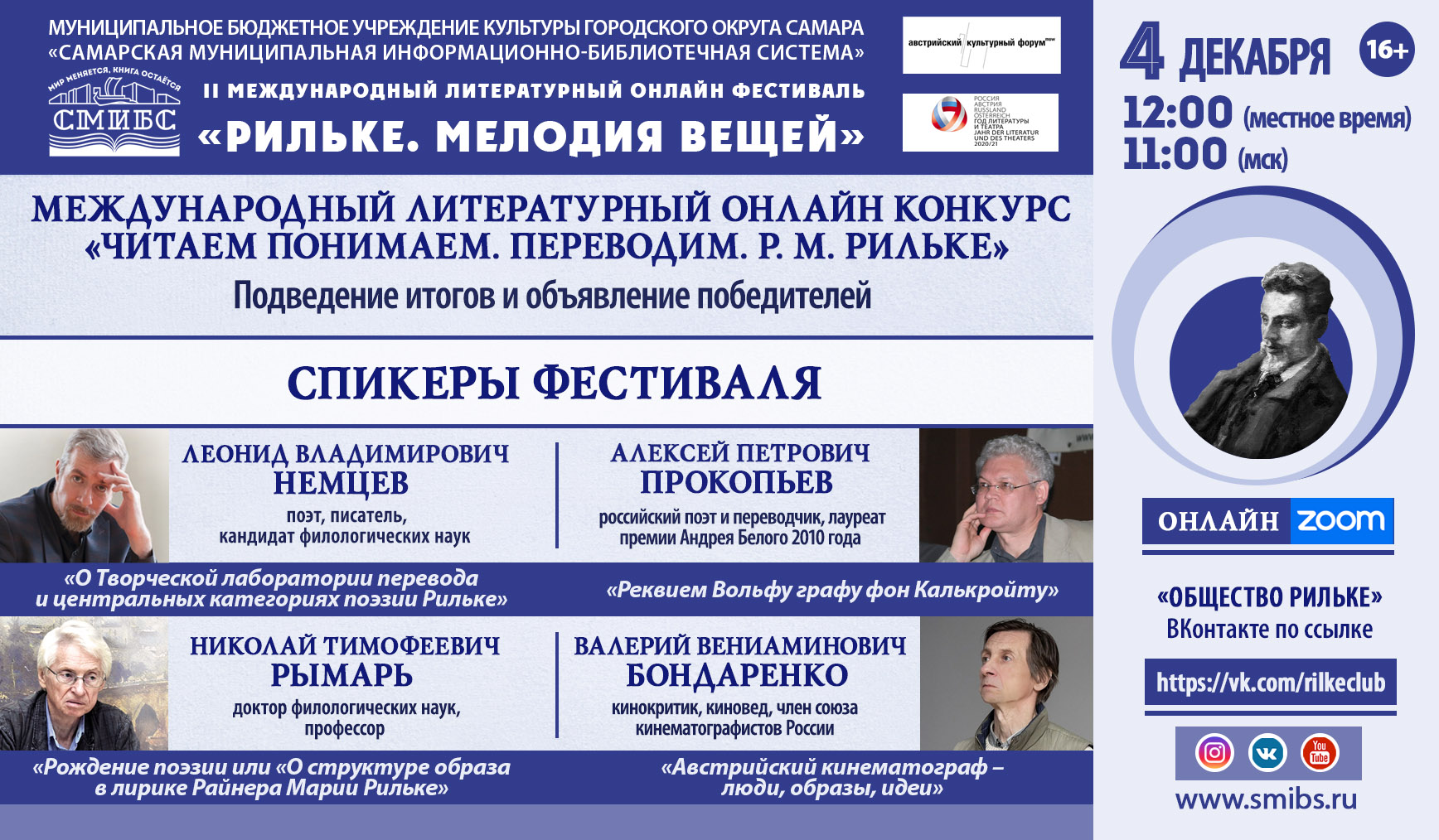 Муниципальное бюджетное учреждение культуры г. о. Самара "Самарская муниципальная информационно-библиотечная система" и Австрийский культурный форум при посольстве Австрии в России (Москва) организуют II Международный литературный фестиваль «Рильке. Мелодия вещей», в рамках Года литературы и театра Австрии и России.