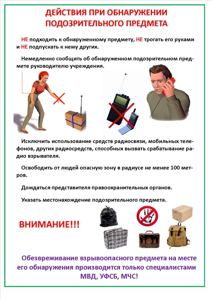 - Бесхозный предмет, обнаруженный в машине, в подъезде, у дверей квартиры, в общественном транспорте, в местах скопления людей