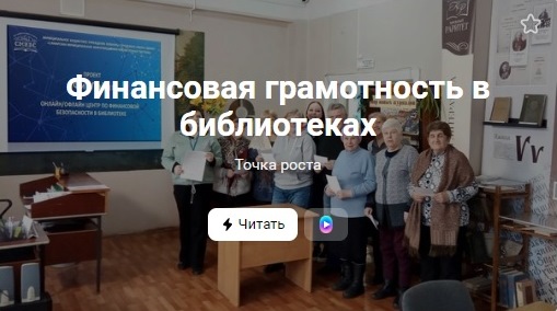 В статье «Финансовая грамотность в библиотеках» (от 12.05.2023г.), опубликованной на странице в социальной сети ВКонтакте сообщества волонтеров финансового просвещения «Точка роста», рассказывается о проекте «Самарской муниципальной информационно-библиотечной системы» (МБУК г. о. Самара «СМИБС») «ФинЛайн», который вошел в число победителей Всероссийского конкурса проектов библиотек в сфере финансовой грамотности (конкурс грантов 2023 года) при поддержке Ассоциации развития финансовой грамотности.