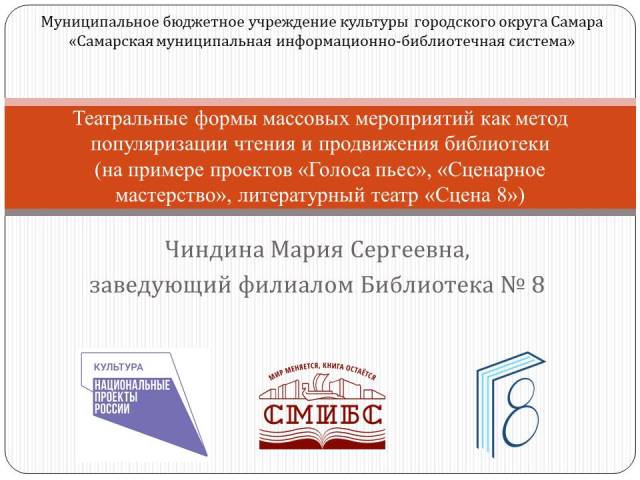 «Театральные формы массовых мероприятий как метод популяризации чтения и продвижения библиотеки (на примере проектов «Голоса пьес», «Сценарное мастерство», «Литературный театр «Сцена 8»)»