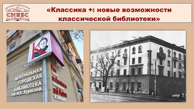 Муниципальное бюджетное учреждение культуры городского округа Самара «Самарская муниципальная информационно-библиотечная система» объединяет 36 библиотек в 9 районах города. МБУК г.о. Самара «СМИБС» создана в декабре 1986 года. Центральная библиотека им. Н.К. Крупской одна из старейших библиотек Самары, которая расположена на самой границе «старого» города - бывшей купеческой Самары и «нового», «советского» города Куйбышев. Центральная библиотека им. Н.К. Крупской имеет статус модельной библиотеки. Перспективная модель библиотеки отвечает формуле: «давние традиции плюс новые технологии», «классика плюс современность» и соответствует образу классической библиотеки, которая успешно встраивается в контекст современной жизни.