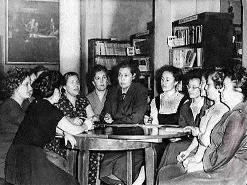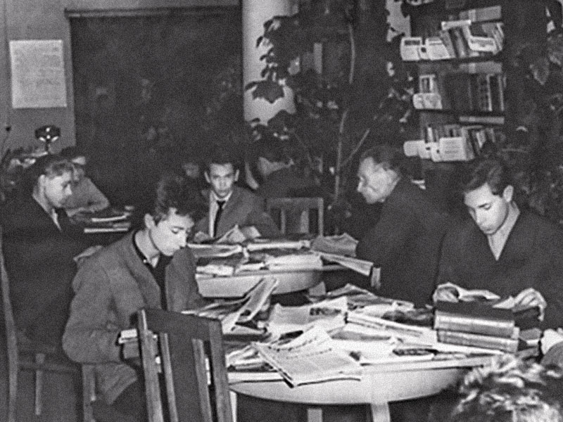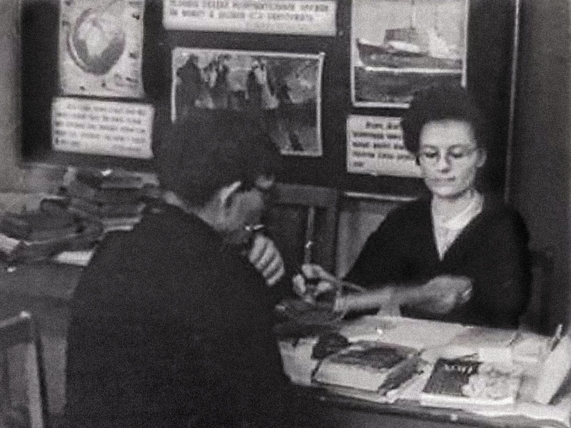 Коллектив библиотеки обсуждает план на 1961 год | Библиотекарь записывает книги читателю |