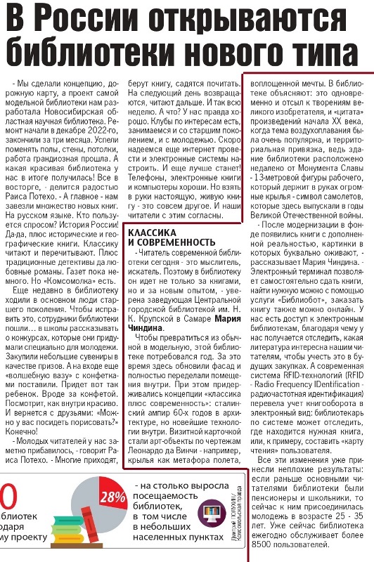 Уважаемые читатели! К Общероссийскому дню библиотек в газете «Комсомольская правда» от 21.05.2024 г. вышла статья, посвященная модельным библиотекам. Вы узнаете о Центральной городской библиотеке им. Н.К.Крупской, которая в 2021 году приобрела статус библиотеки модельного стандарта в рамках национального проекта «культура», о концепции «классика плюс современность» и о том, что нового произошло в библиотеке после модернизации.