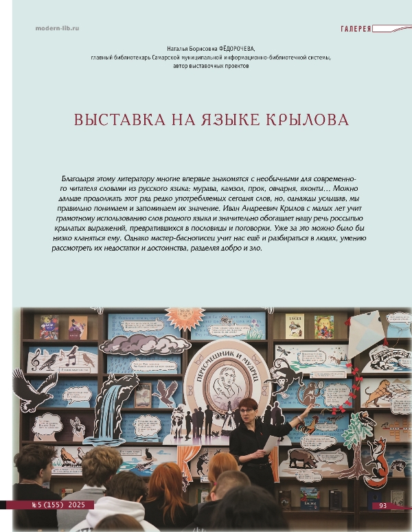 В журнале «Современная библиотека» №5 (155) вышла статья главного библиотекаря Фёдорочевой Натальи Борисовны с говорящим названием «Выставка на языке Крылова». На страницах популярного научно-практического издания автор рассказывает об особенностях выставочного проекта «Пересмешник и мудрец», реализованного на базе Библиотеки №9 Самарской муниципальной информационно-библиотечной системы.