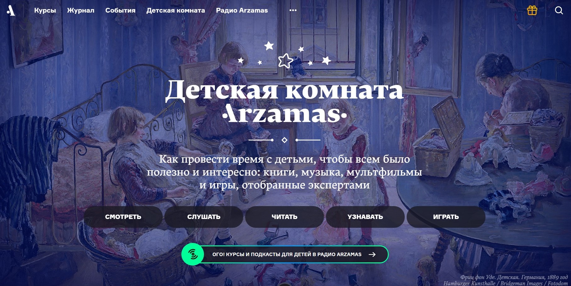 Просветительский проект Arzamas предлагает специальный раздел для детей, содержащий несколько рубрик: смотреть, слушать, читать, узнавать, играть.