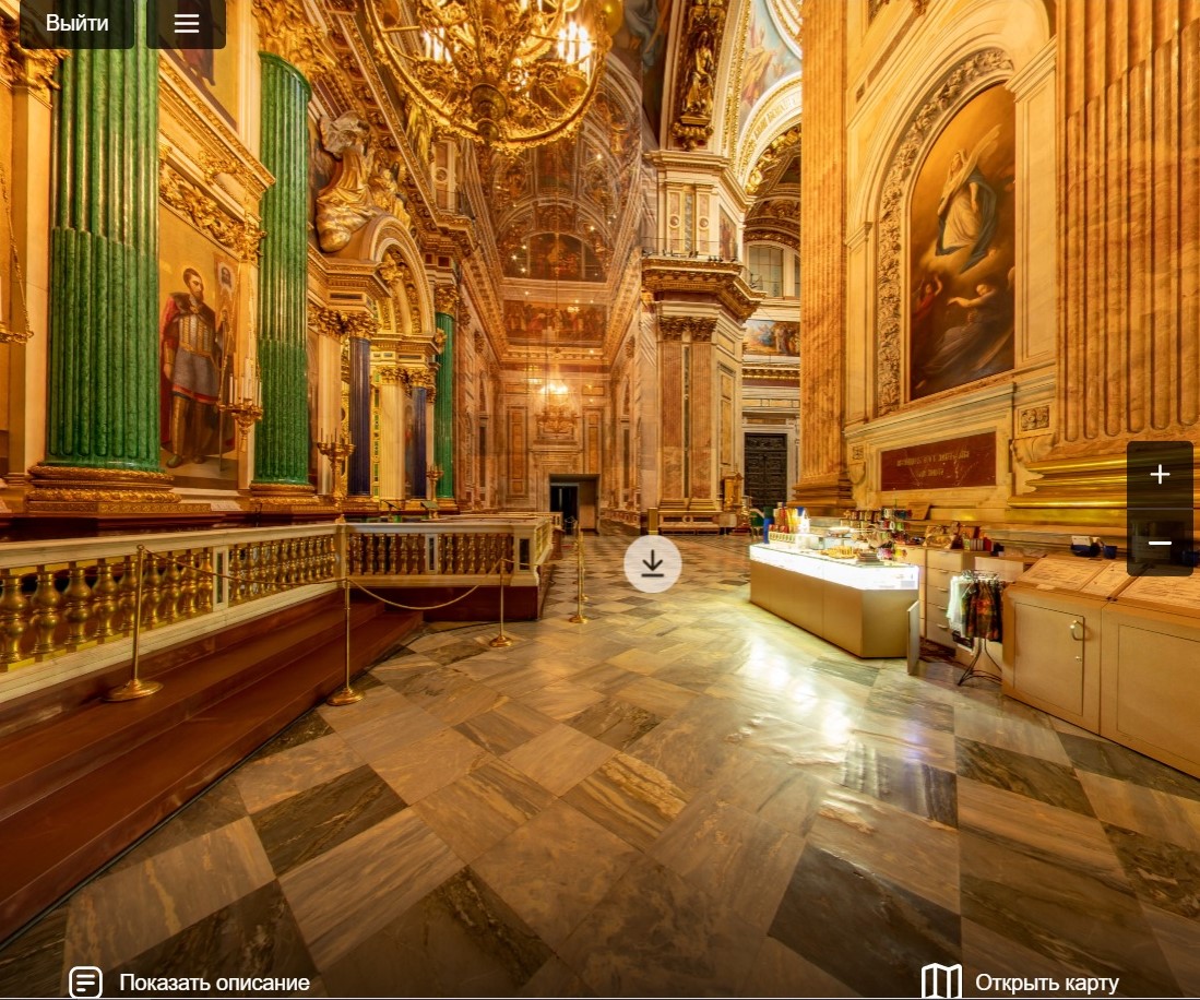 Исаакиевский собор – посетив виртуальную экскурсию, Вы сможете не только рассмотреть богатое убранство собора, но и прочитать пояснительную информацию.