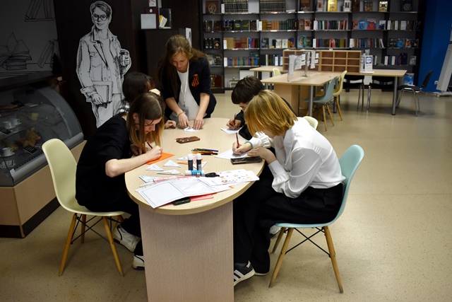 Все желающие смогли поучаствовать в мастер-классе по созданию открытки ко дню Победы «Спасибо прадеду за Победу!». Библиотекарь показала, как можно быстро создать красочную открытку для своих близких к 9 Мая.