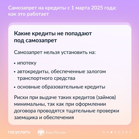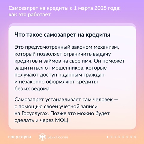 Как новый механизм поможет защититься от мошенников? Какие самозапреты можно установить через учетную запись на Госуслугах и на какие кредиты они будут распространяться? О самых важных нюансах нового механизма — в карточках.