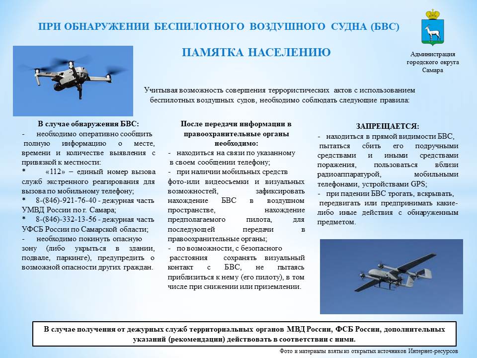 Администрация городского округа Самара сообщает, что нужно делать при обнаружении беспилотного летательного аппарата и беспилотного воздушного судна.
