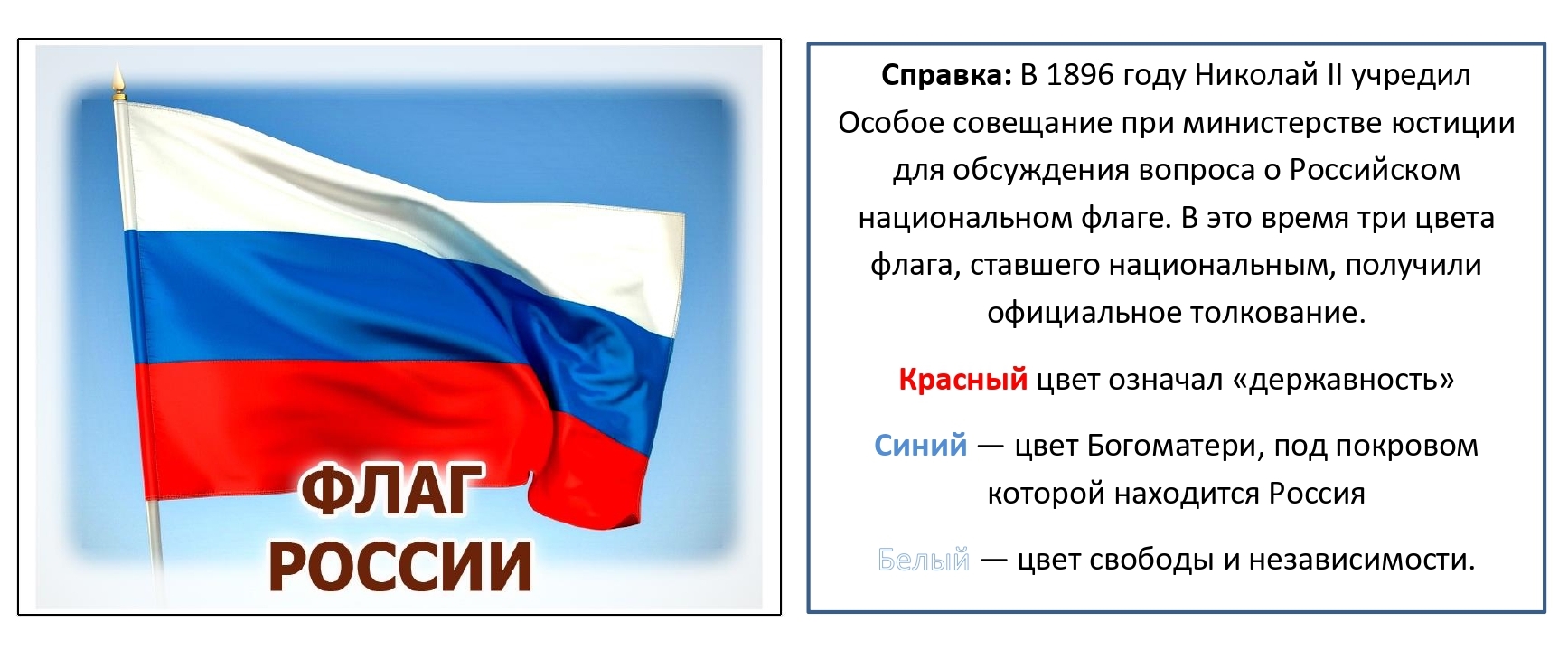 В 1896 году Николай II учредил Особое совещание при министерстве юстиции для обсуждения вопроса о Российском национальном флаге. В это время три цвета флага, ставшего национальным, получили официальное толкование.