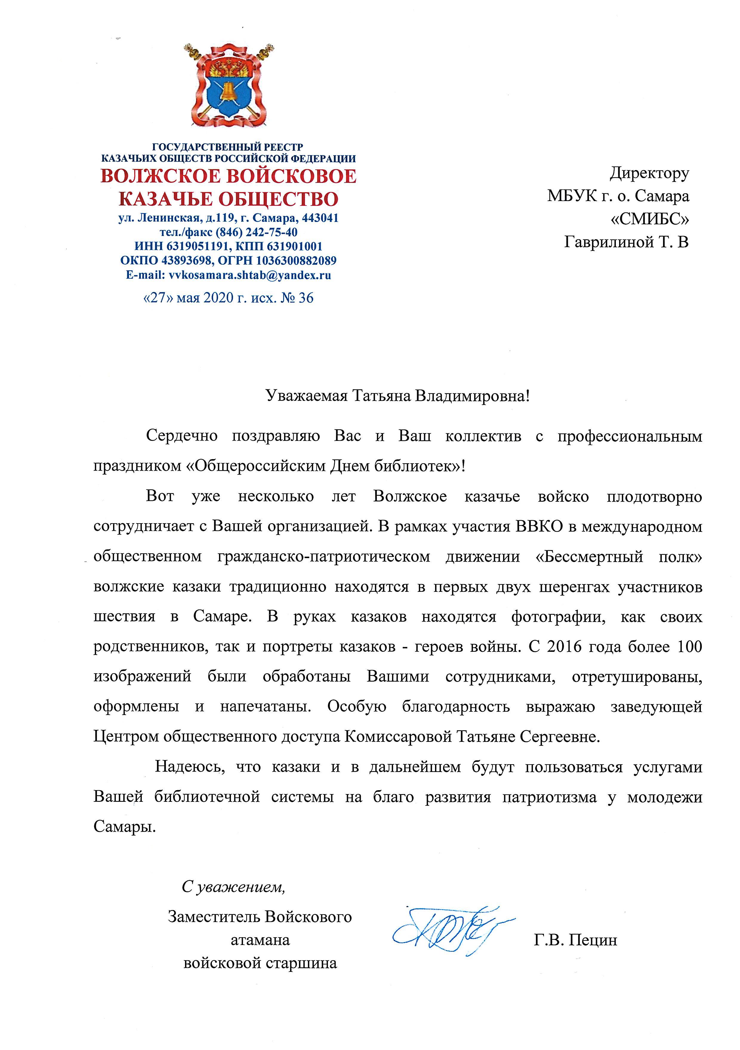 «Самарская муниципальная информационно-библиотечная система» в лице директора Гаврилиной Татьяны Владимировны благодарит Пецина Геннадия Витальевича, атамана Волжского казачьего войска, за плодотворное сотрудничество! Надеемся на дальнейшую совместную деятельность и желаем Вам всех благ!