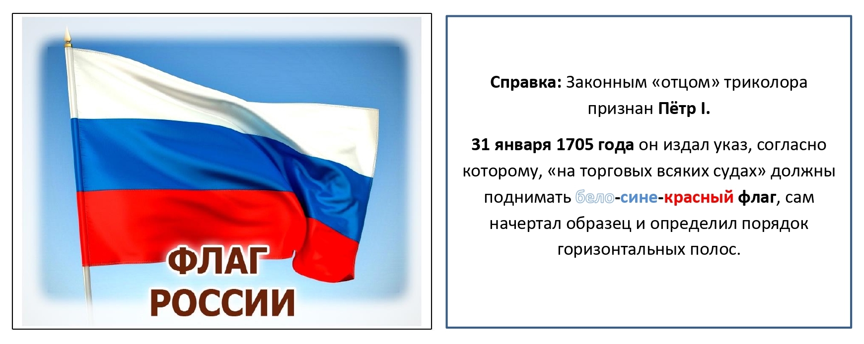 Законным «отцом» триколора признан Пётр I. 31 января 1705 года он издал указ, согласно которому, «на торговых всяких судах» должны поднимать бело-сине-красный флаг, сам начертал образец и определил порядок горизонтальных полос.