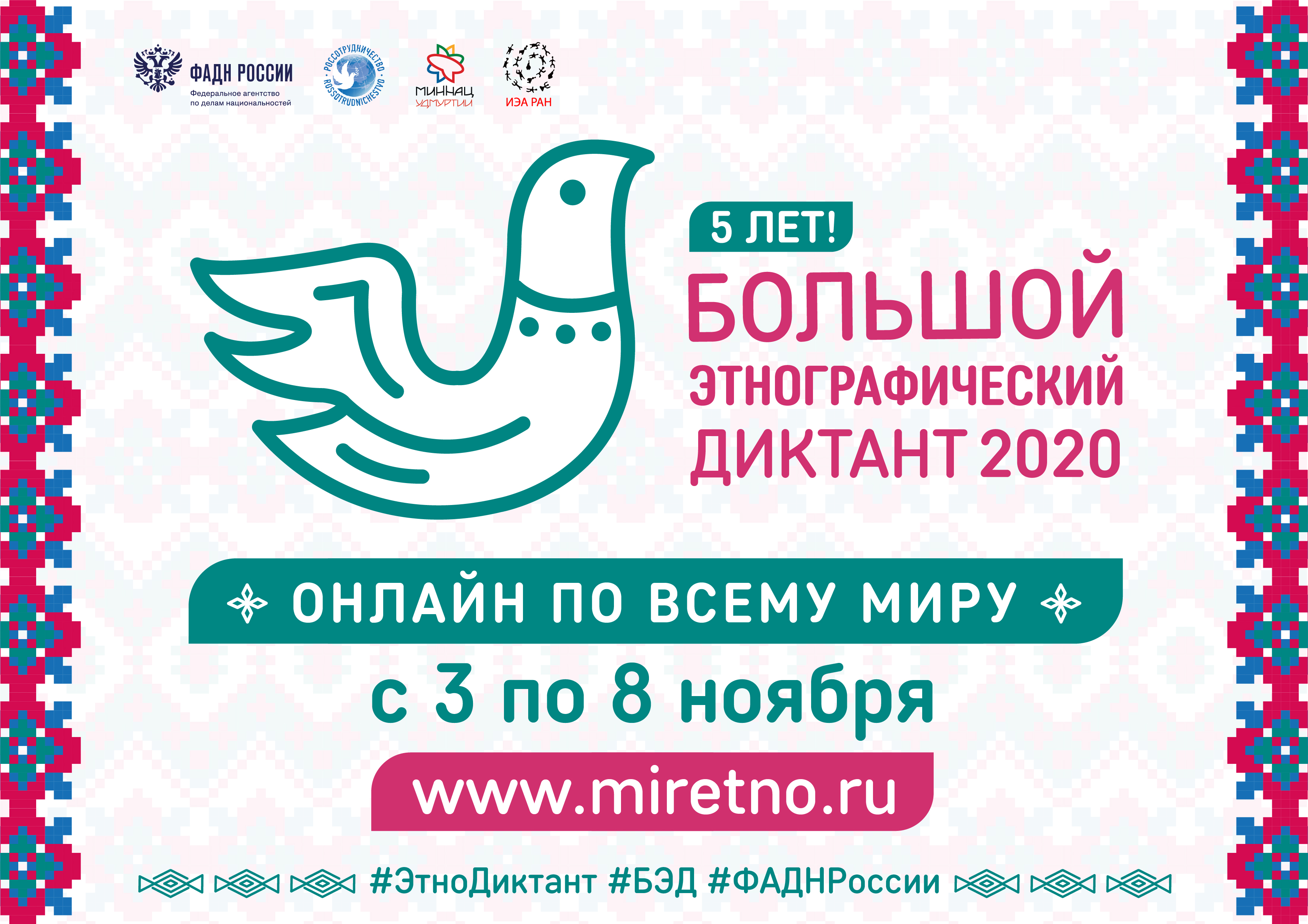 Задания будут опубликованы в 00.01 час. 3 ноября 2020 года (по моск.вр.) на официальном сайте Большого этнографического диктанта www.miretno.ru.