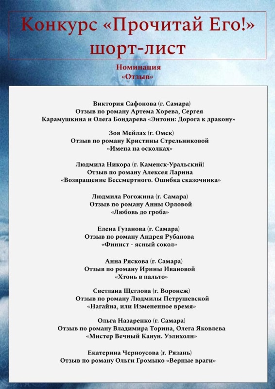 Во II Всероссийском конкурсе «Прочитай его!» проекта «Дирижабли. Литературный клуб русского фэнтези» объявлены полуфиналисты: