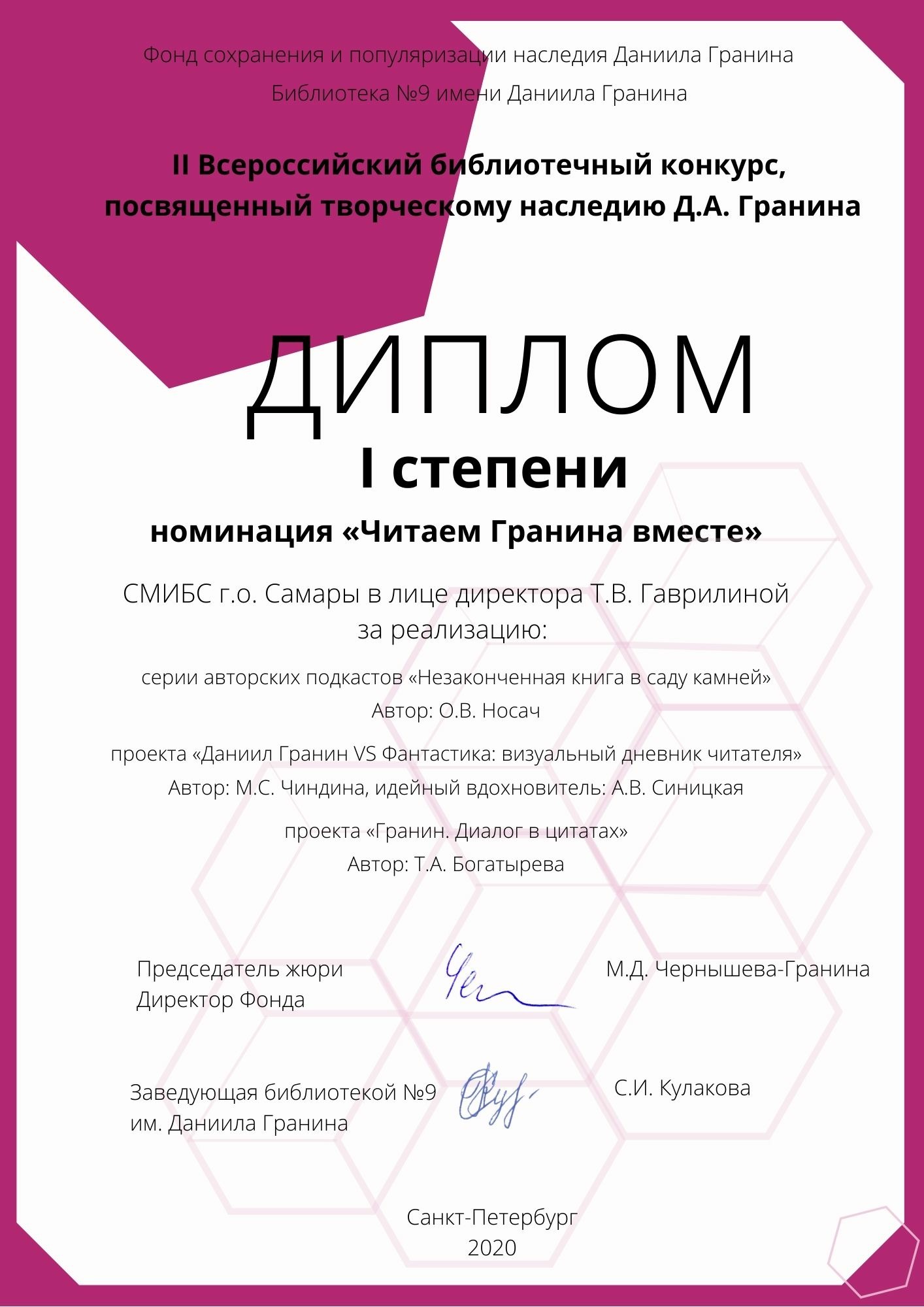 - Паниной Наталье Владимировне, библиотекарю Библиотеки №11 МБУК г. о. Самара «СМИБС»