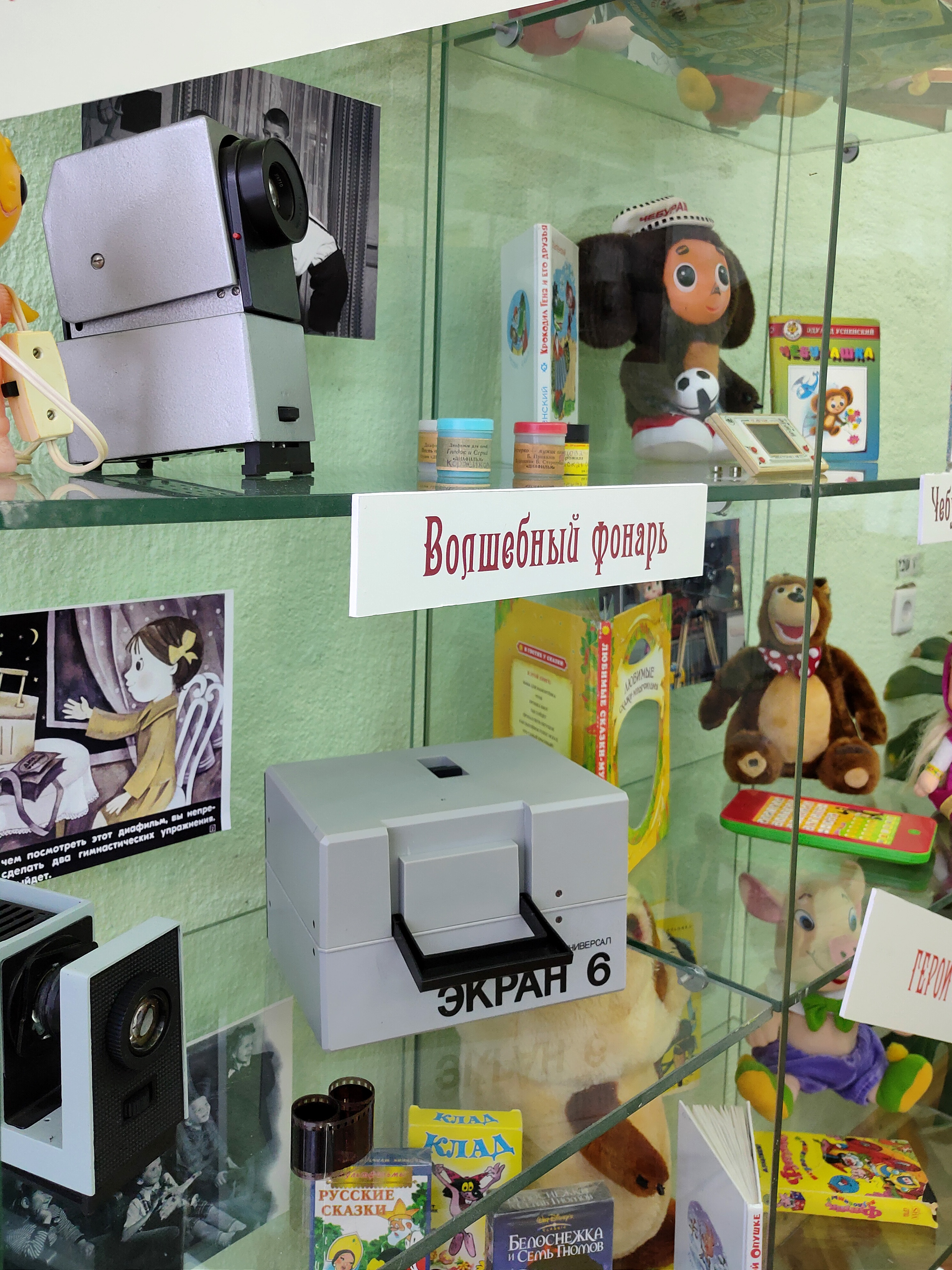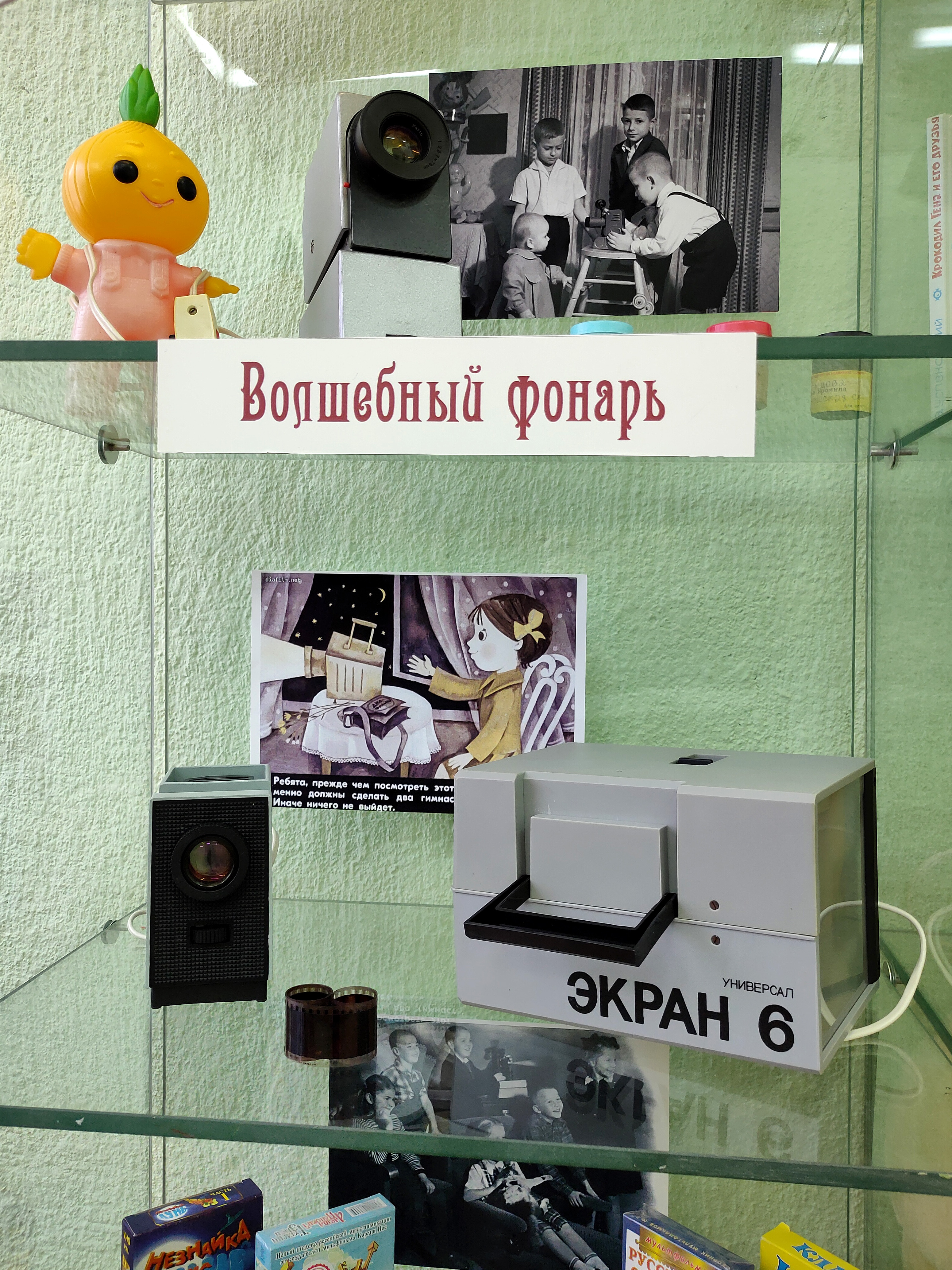 Самой первой экспозицией «Музея» стали не только игрушки, но и предметы, тесно связанные с развитием культуры мультипликации. Что такое диафильмы и диапроекторы, как они появились и какую роль играли в жизни детей и родителей прошлого века – об этом узнали наши гости, побывавшие на презентации выставки. Не обошлось и без игры, которая всем очень понравилась, ведь можно было не только увидеть, но и потрогать руками вещи, которые давно стали историей, и многие из ребят их даже никогда не видели. Дети и родители с удовольствием рассматривали плёнки диафильмов и вспоминали произведения, которые они иллюстрируют.