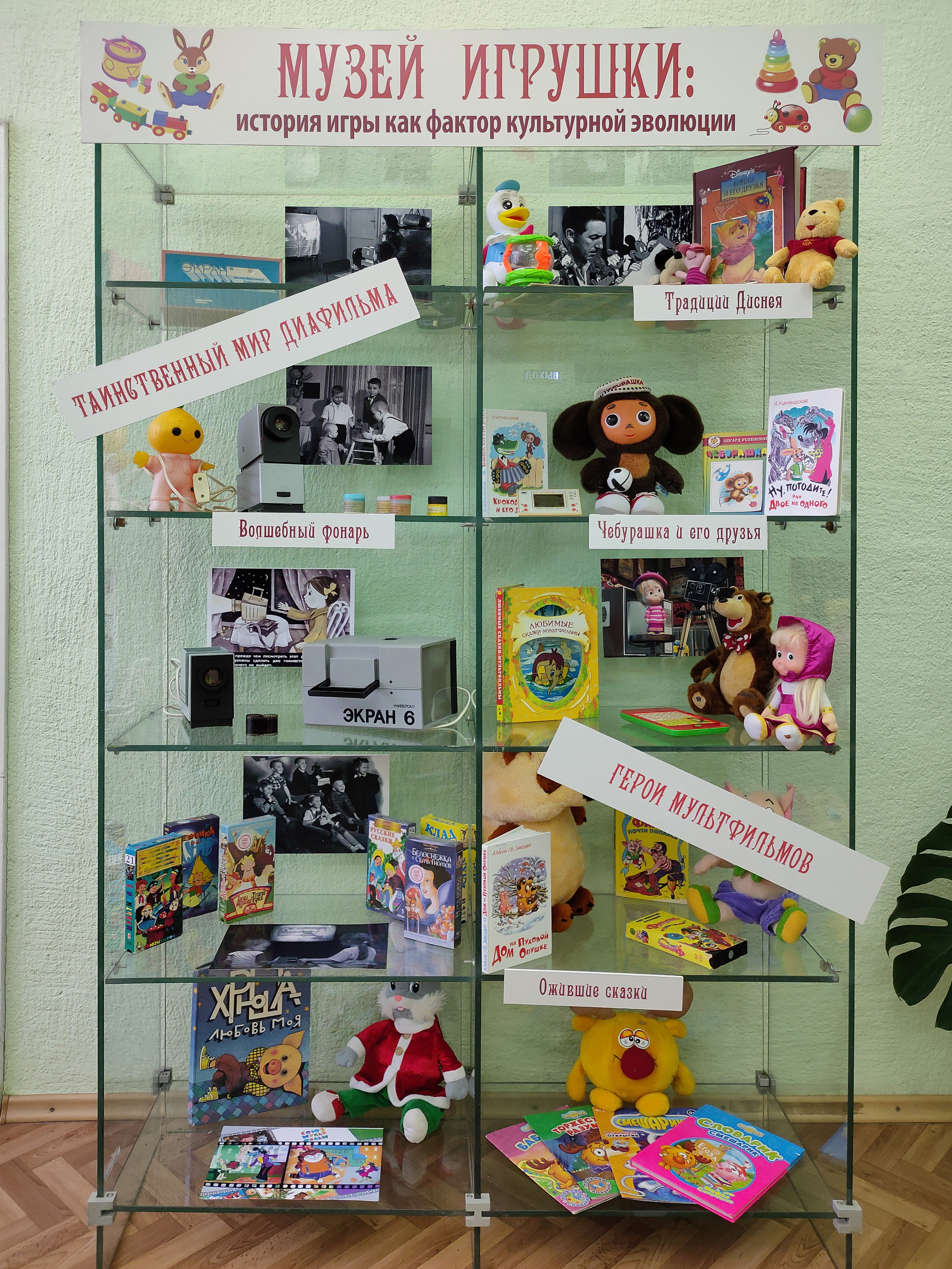 Самой первой экспозицией «Музея» стали не только игрушки, но и предметы, тесно связанные с развитием культуры мультипликации. Что такое диафильмы и диапроекторы, как они появились и какую роль играли в жизни детей и родителей прошлого века – об этом узнали наши гости, побывавшие на презентации выставки. Не обошлось и без игры, которая всем очень понравилась, ведь можно было не только увидеть, но и потрогать руками вещи, которые давно стали историей, и многие из ребят их даже никогда не видели. Дети и родители с удовольствием рассматривали плёнки диафильмов и вспоминали произведения, которые они иллюстрируют.