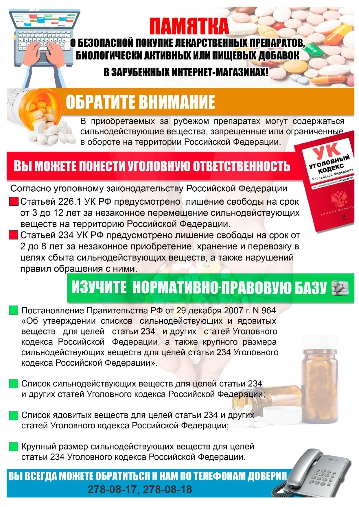 С целью информирования населения Министерство внутренних дел РФ разработало специальную памятку, где указана предусмотренная законом ответственность за приобретение препаратов с содержанием сильнодействующих веществ, опасных для здоровья человека, под видом биологически активных или пищевых добавок.