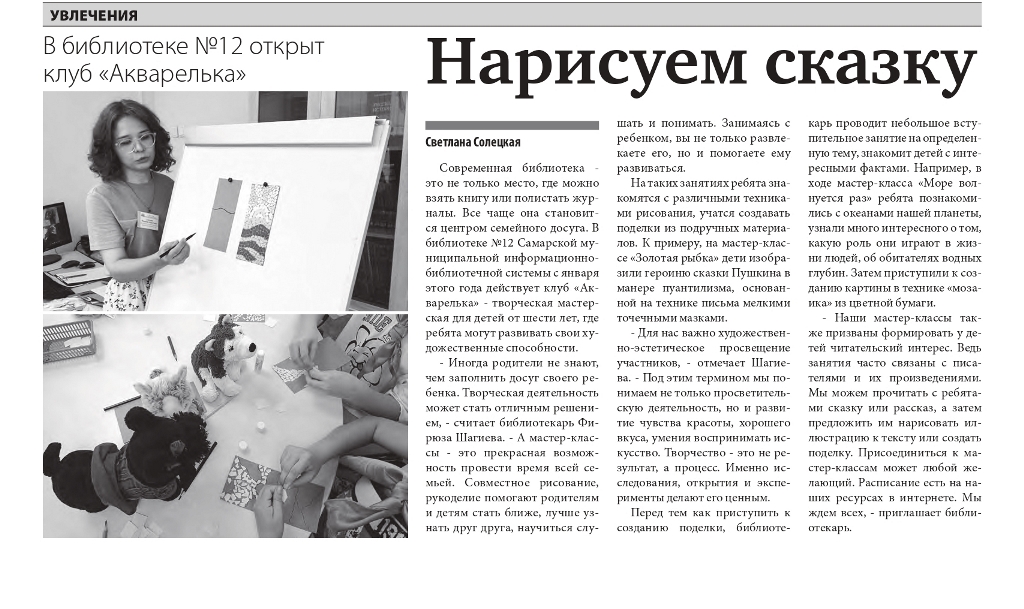 Современная библиотека - это не только место, где можно взять книгу или полистать журналы. Все чаще она становится центром семейного досуга. В Библиотеке №12 Самарской муниципальной информационно-библиотечной системы с января этого года действует клуб «Акварелька» - творческая мастерская для детей от шести лет, где ребята могут развивать свои художественные способности.