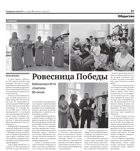 Библиотека №16 отметила свой юбилей – 80 лет со дня рождения. Это одна из старейших библиотек Промышленного района. Сотрудники гордо называют ее ровесницей Победы, поскольку она была открыта в конце мая 1945 года.