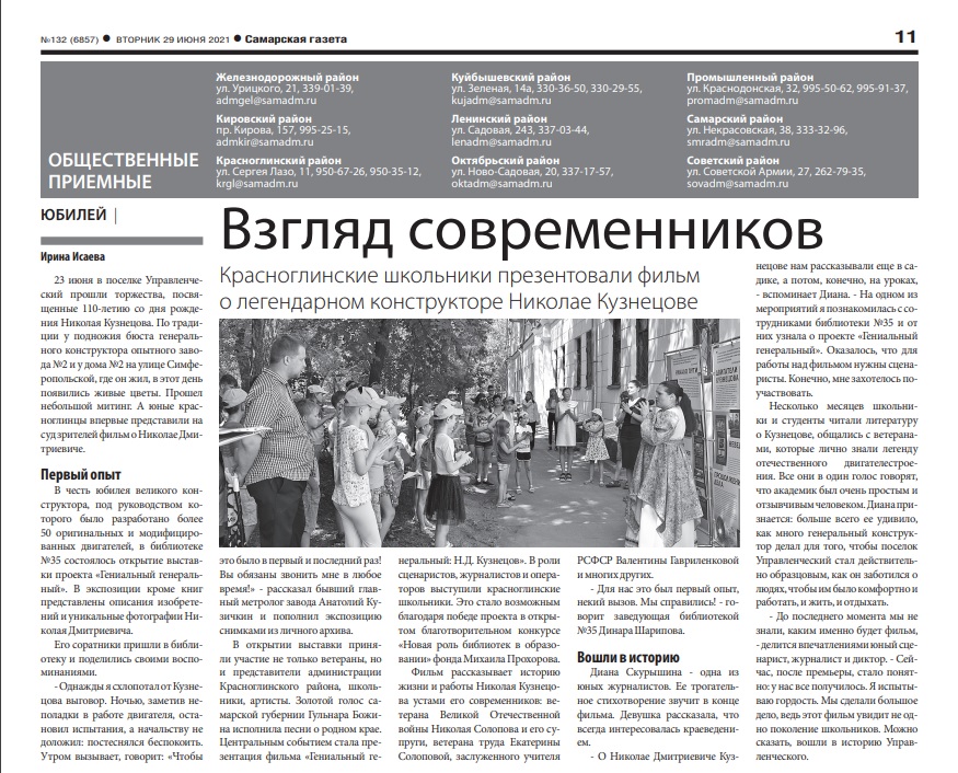 Взгляд современников. Красноглинские школьники презентовали фильм о легендарном конструкторе Николае Кузнецове, а в Библиотеке №35 МБУК г.о. Самара "СМИБС" состоялось открытие выставки проекта «Гениальный генеральный»