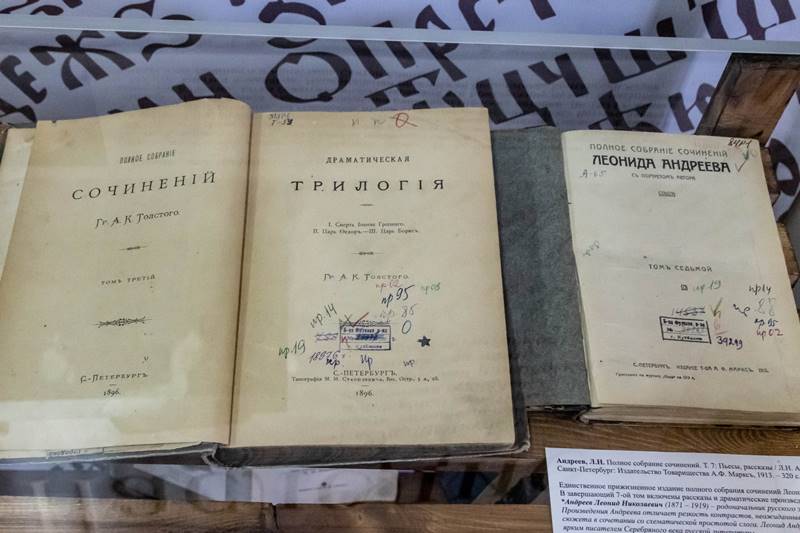 «Русская литература». Раздел включает в себя первый том полного собрания сочинений Константина Сергеевича Аксакова (1889), с заметками и статьями по разным вопросам русской истории и исследованиями основного быта и сложения русской земли, «Полное собрание сочинений» в 3-х томах (1906) известного русского поэта и писателя, основоположника романтизма в русской литературе, учителя Александра II — Василия Жуковского, «Полное собрание сочинений» в 3-х томах (1893) поэта, журналиста Аполлона Майкова. Во втором томе Майкова имеется факсимиле со стихотворением «Пустынник». Также в этом разделе представлены произведения Льва Толстого (1897) и других знаменитых русских классиков.