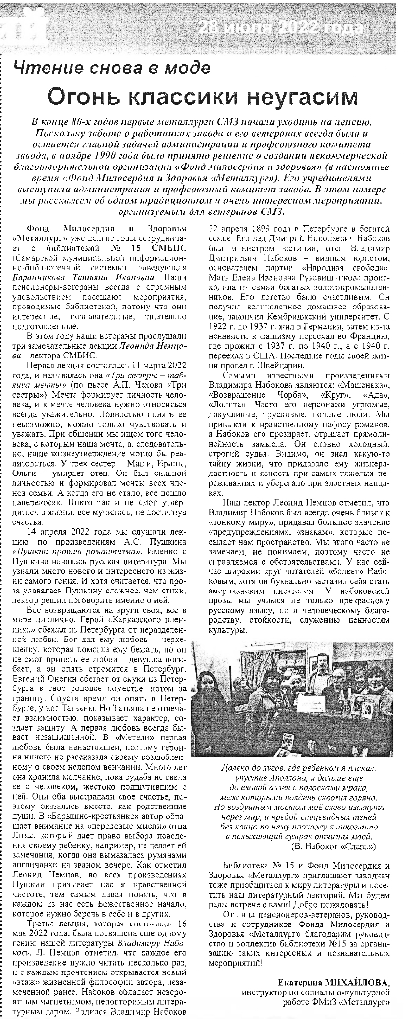 Дорогие друзья! Приглашаем к прочтению статьи из газеты "Рабочий" о культурно-познавательных литературных лекциях Леонида Немцева, которые были проведены в Библиотеке №15 СМИБС для пенсионеров-ветеранов завода "Металлург"