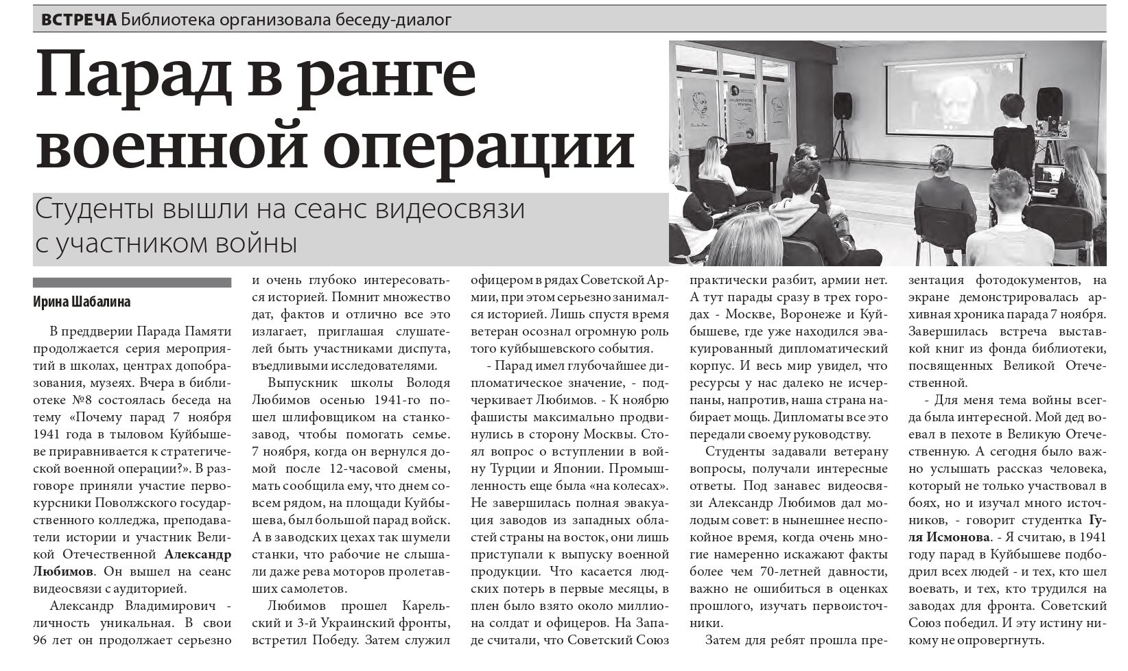 В преддверии 79-й годовщины военного парада 7 ноября 1941 года в библиотеке №8 состоялась беседа на тему: «Почему парад 7 ноября 1941 года в тыловом Куйбышеве приравнивается к стратегической военной операции?»
